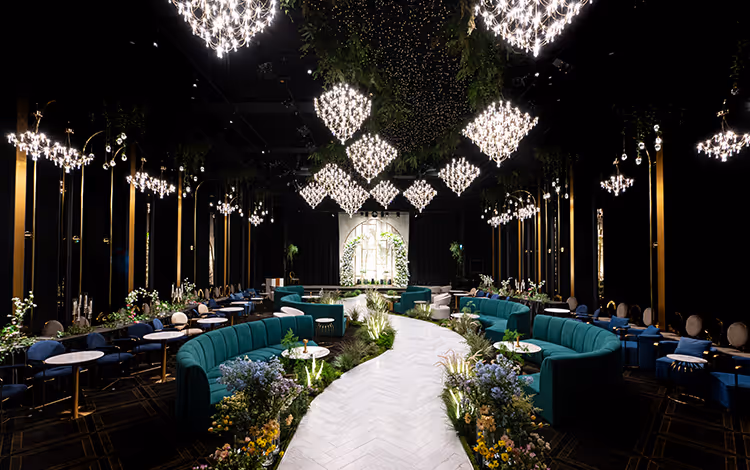 화이트톤 인테리어와 세련된 조명으로 꾸며진 웨딩홀이에요.