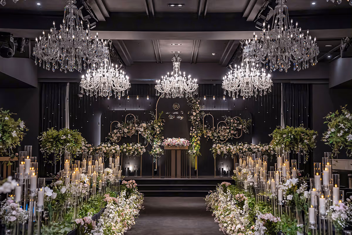 고급스럽고 화려한 인테리어, 천장 조명이 어우러져 본식 사진이 정말 예쁘게 나옵니다.