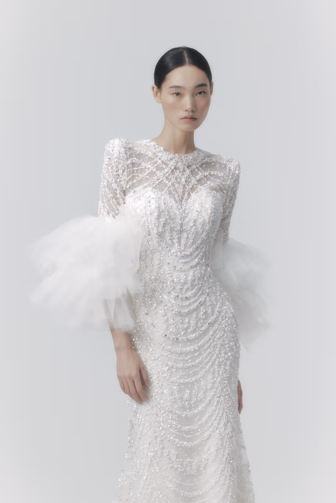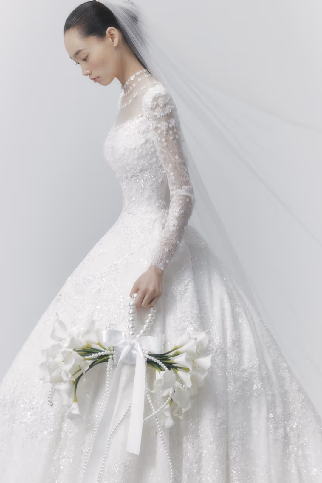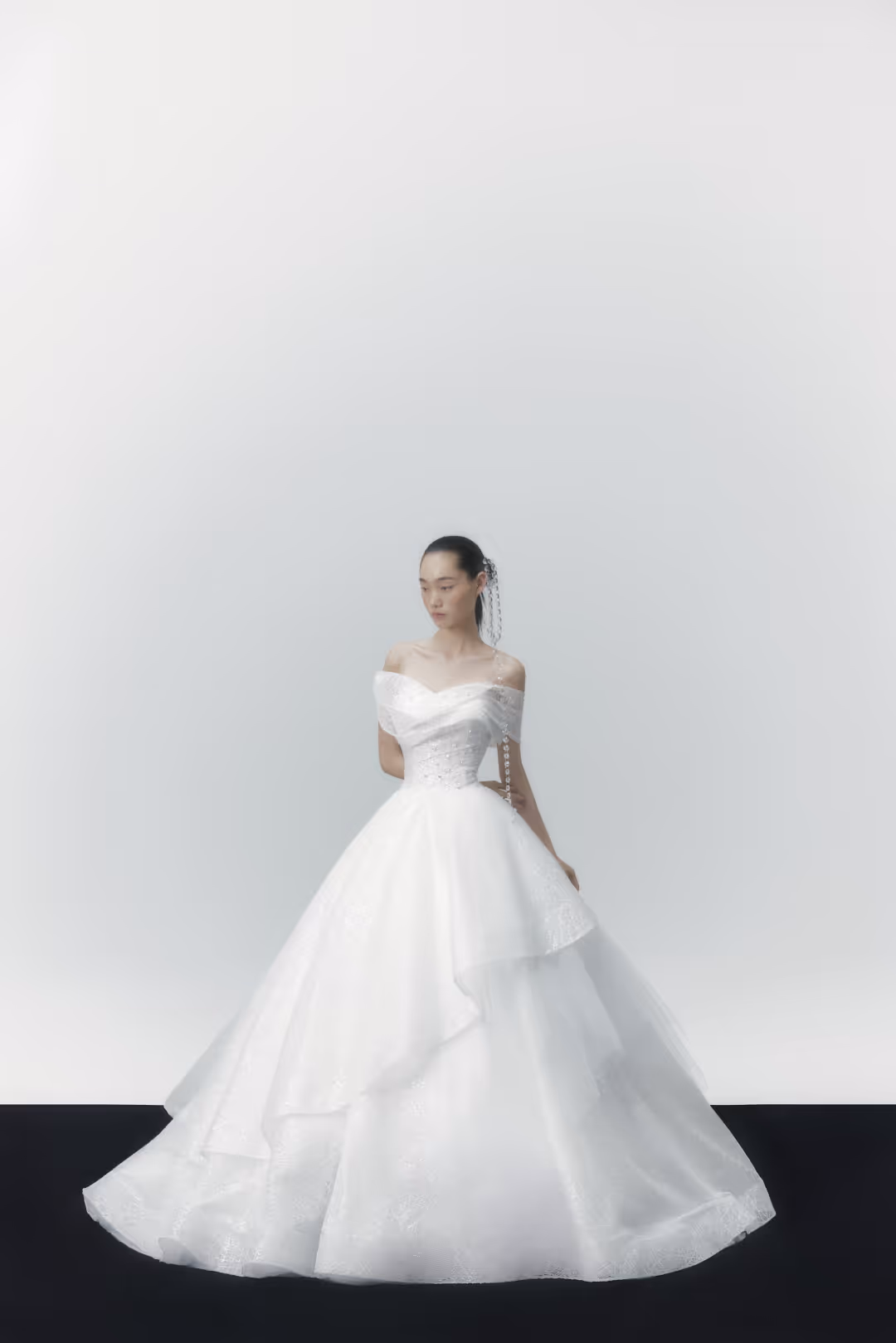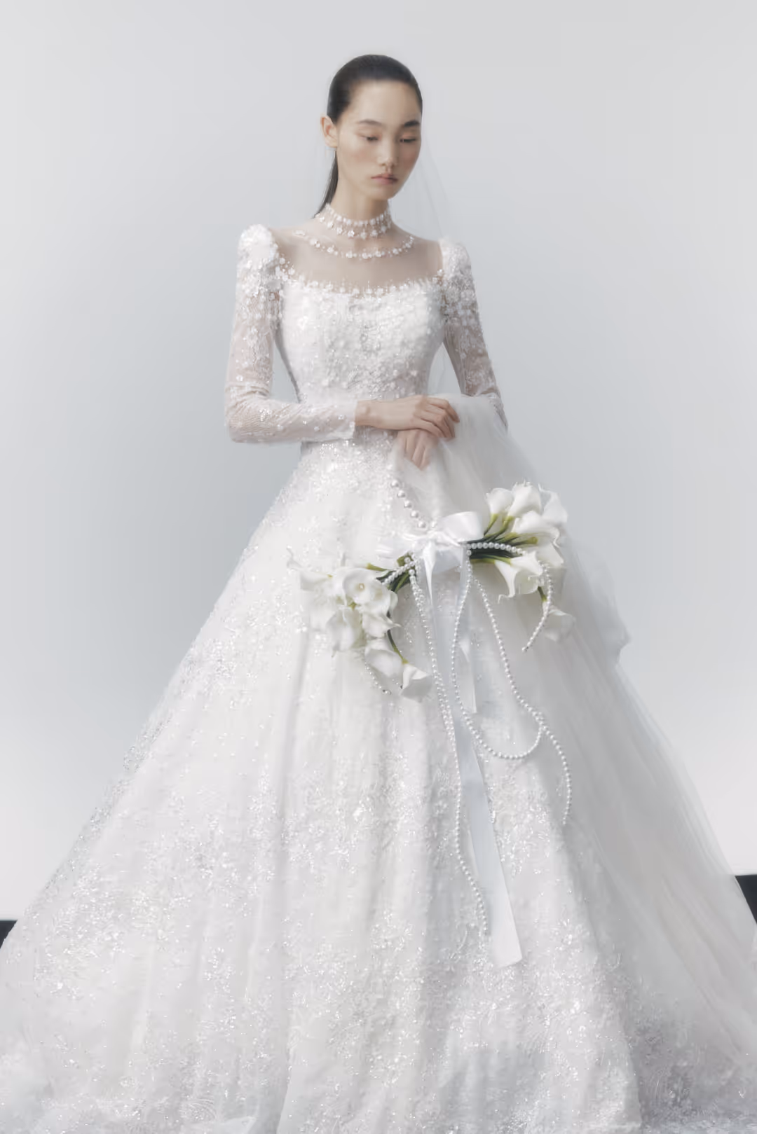 너무 과한 비즈보다는 맑은 비즈가 은은하게 빛 나는 드레스를 원했어요.
