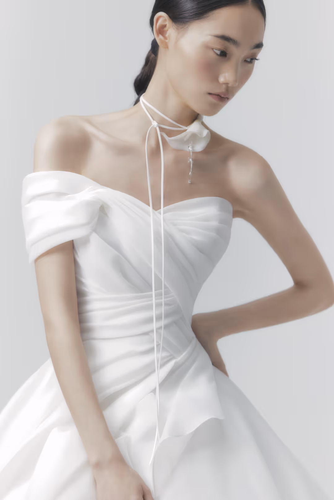 그리고 결혼식이 시작되고 본식이 진행될 때는 넥 라인이 드러나게끔 변형하여 목선과 쇄골 라인이 시원하게 드러나도록 연출했답니다.