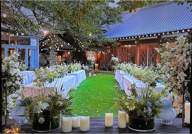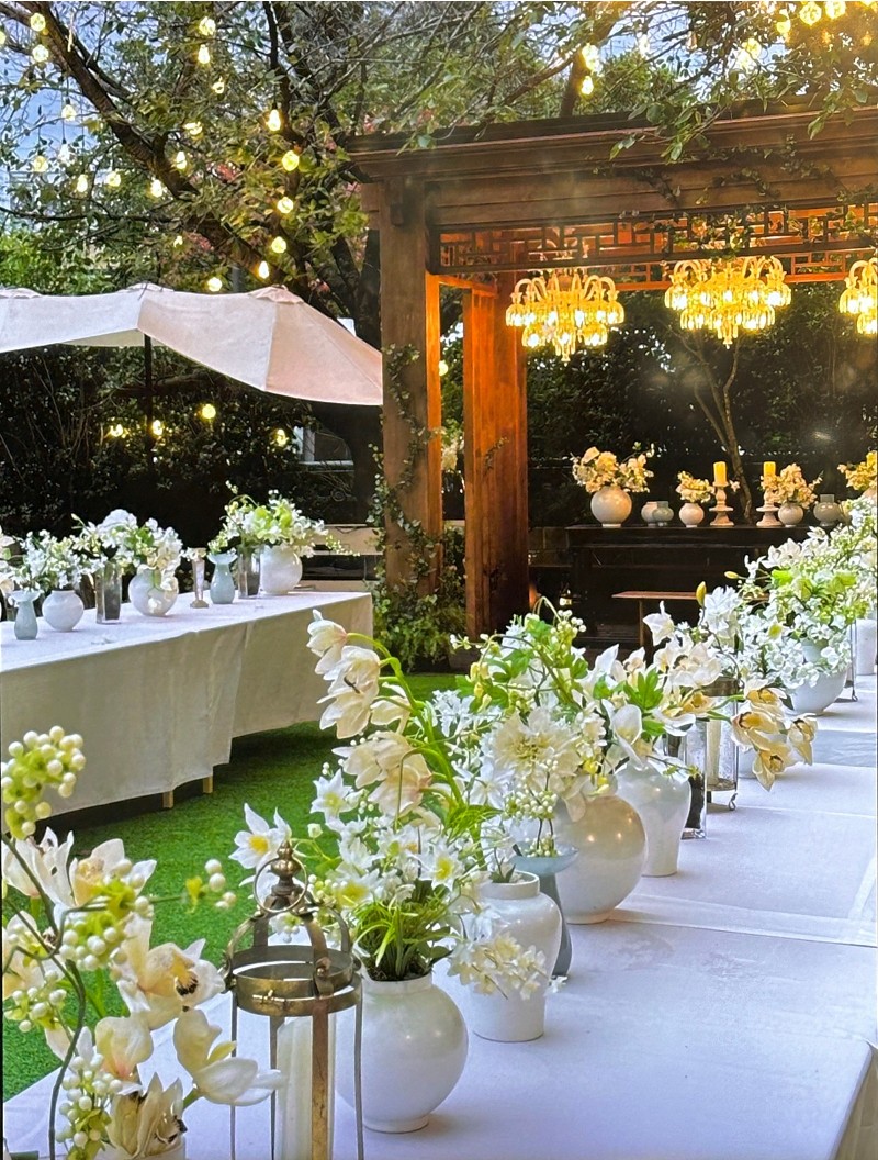 첫 번째는 샹들리에로 장식되어 있는 입구, 두 번째는 마당 안쪽 벤치인데 여기를 생화로 장식하면 너무 예뻤어요