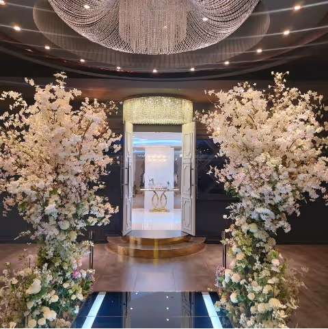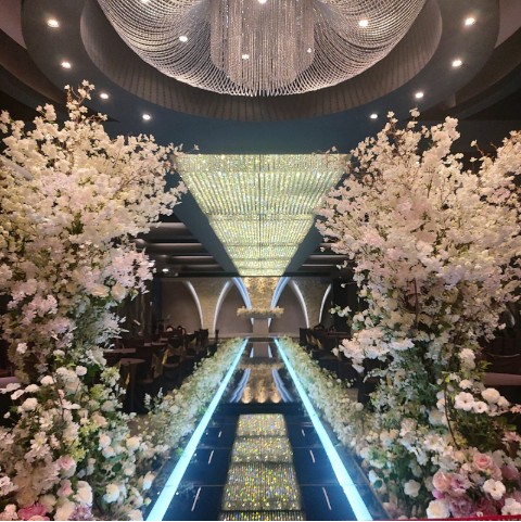 그리고 조명이 켜진 상태에서 뒤돌아서 하객측을 바라봤을때의 시야였어요. 밝은 조명에 꽃길이 촥~ 너무 설레는 모습이었어요!!