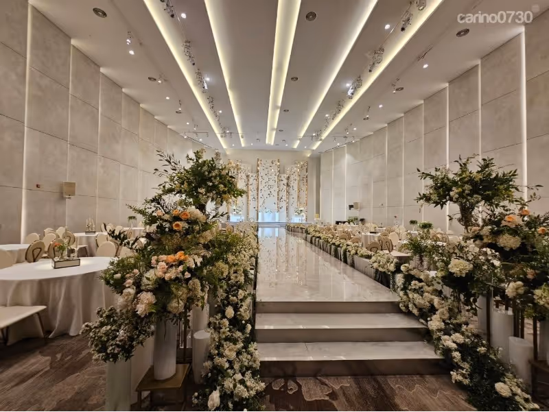 꽃을 테마로한 포인트가 눈에 띄었어요. 하객이 많아도 걱정없을정도로 여유로운 로비공간을 가지고있다는 장점이 있답니다.