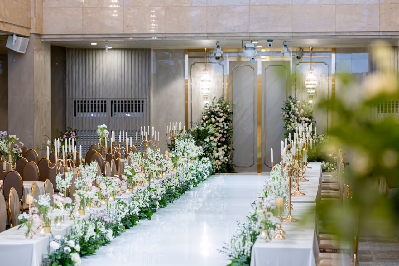 28m의 긴 버진로드와 국내 최대층고인 20m 단독홀을 갖춘 웨딩홀 1700여대 여유로운 주차공간 보유 초대형 4k LED 디스플레이로 특별한 웨딩연출